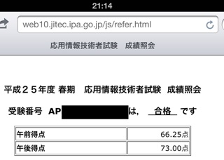 苦節2年 投稿者:Himitsude Com6月 30, 2013カテゴリー:サ央ツ兀 先週の話ですが、ようやく応用情報技術者試験に合格しました! 落ちない写真を撮ったのが良かったのか、三度目の正直だったのか、とにかく受かりました。長かった、辛かった… ただこれで終わりと言い訳でもなく、これから先はさらに上位の資格を目指さなきゃいけないし、勉強の日々は続く。今までサボっていたツケは大きいな。もうちょっとコツコツ続けていかなきゃダメですね。 さて、秋の試験も110日あまり、あっという間にその日が来そうだ。 得点の画面キャプチャ 投稿者: Himitsude Com Love our JEF! Love our Chiba! 他の投稿を表示